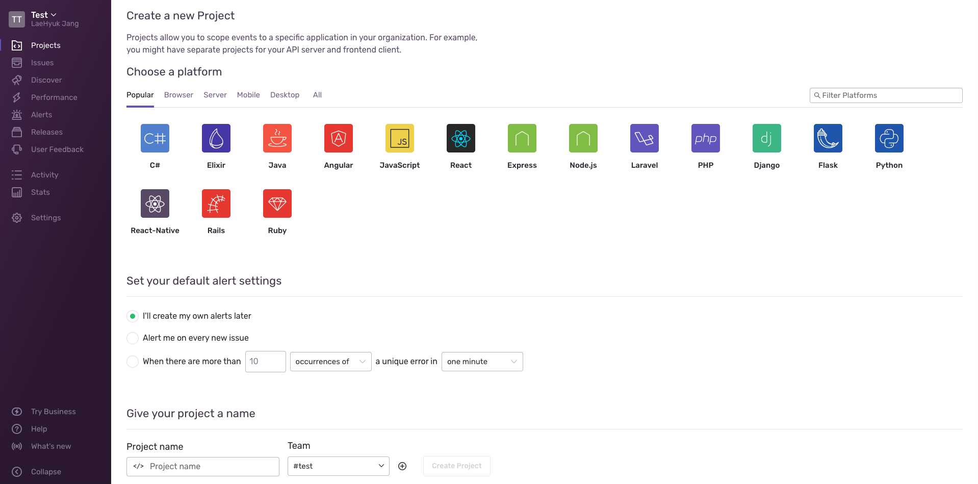 Sentry 프로젝트 생성하기