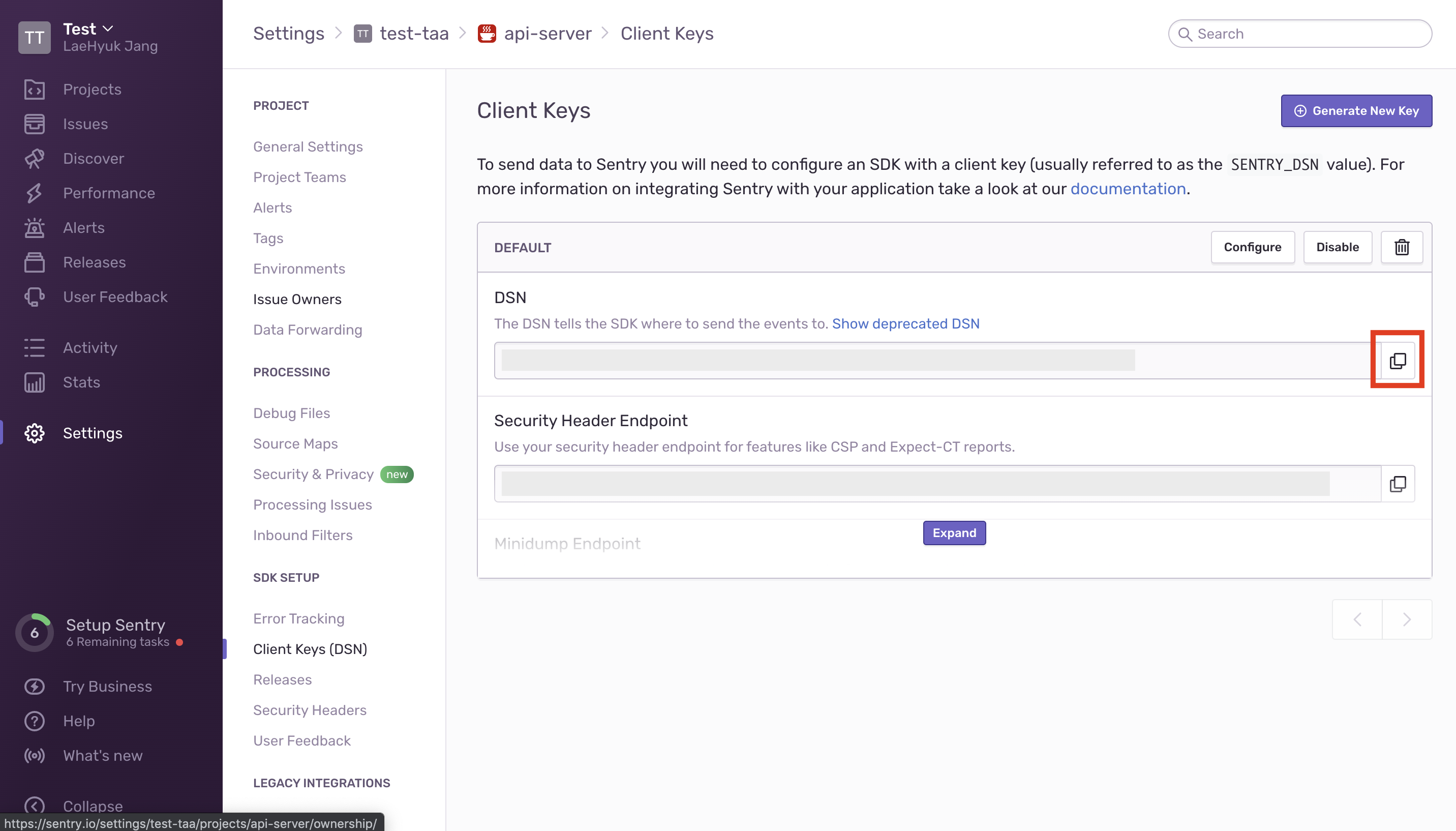 DSN(Data Source Name)은 Sentry의 프로젝트 단위별로 발급이 된다. 적용할 어플리케이션에서 Sentry 프로젝트의 DSN을 복사해서 설정해주면 됩니다.