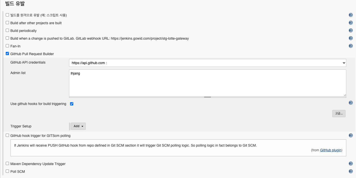 GitHub Pull Request Builder 를 선택 하고 Use github hooks for build triggering 체크합니다.